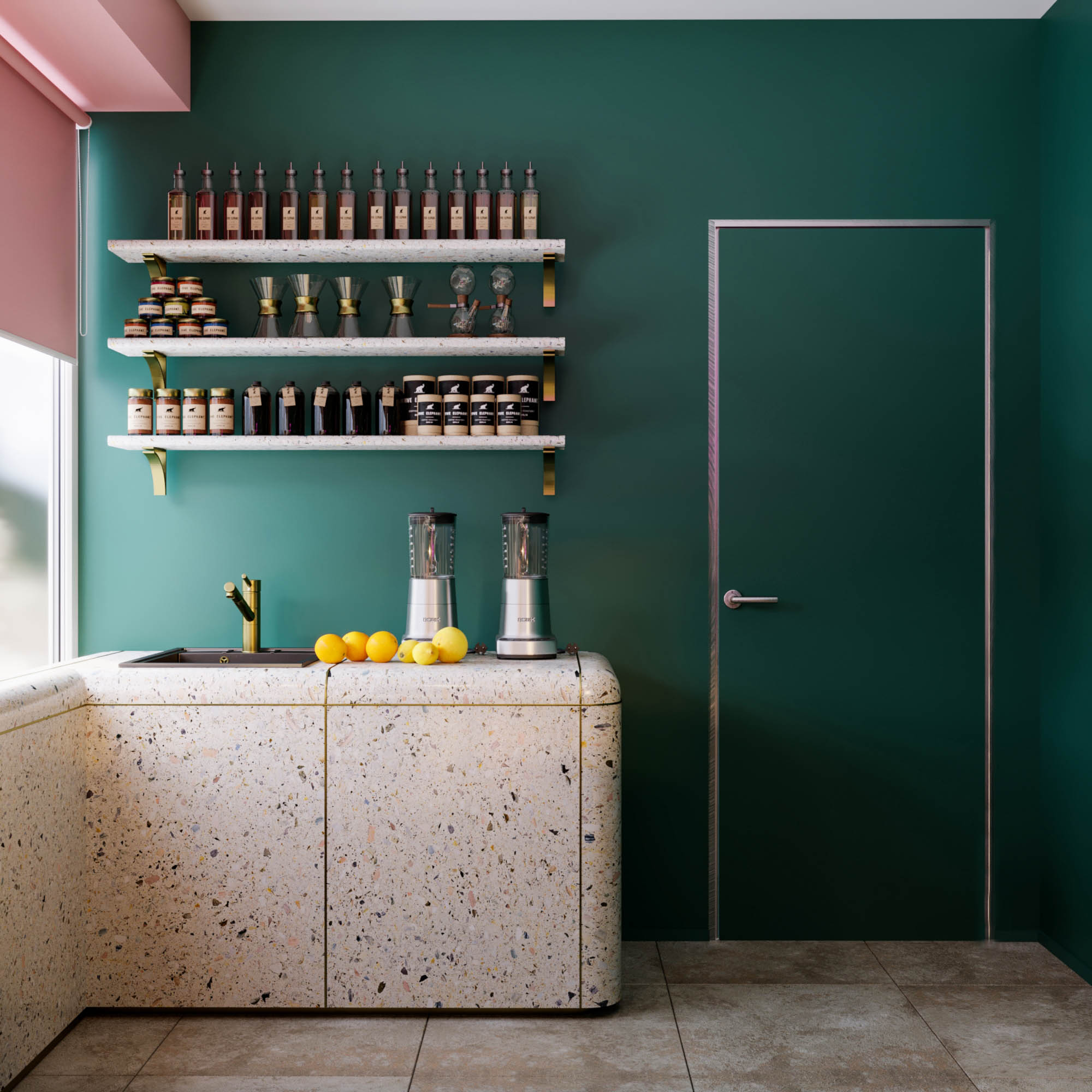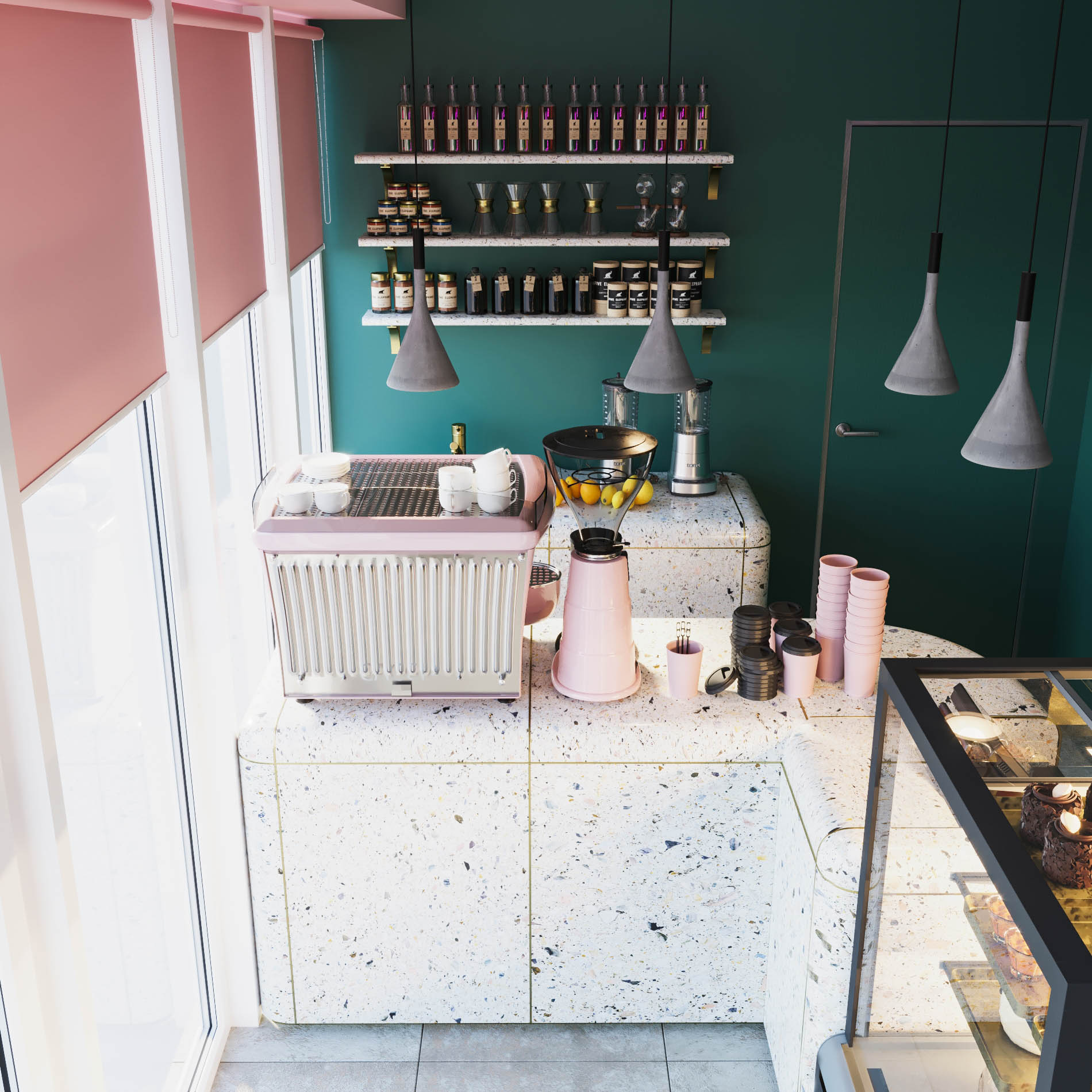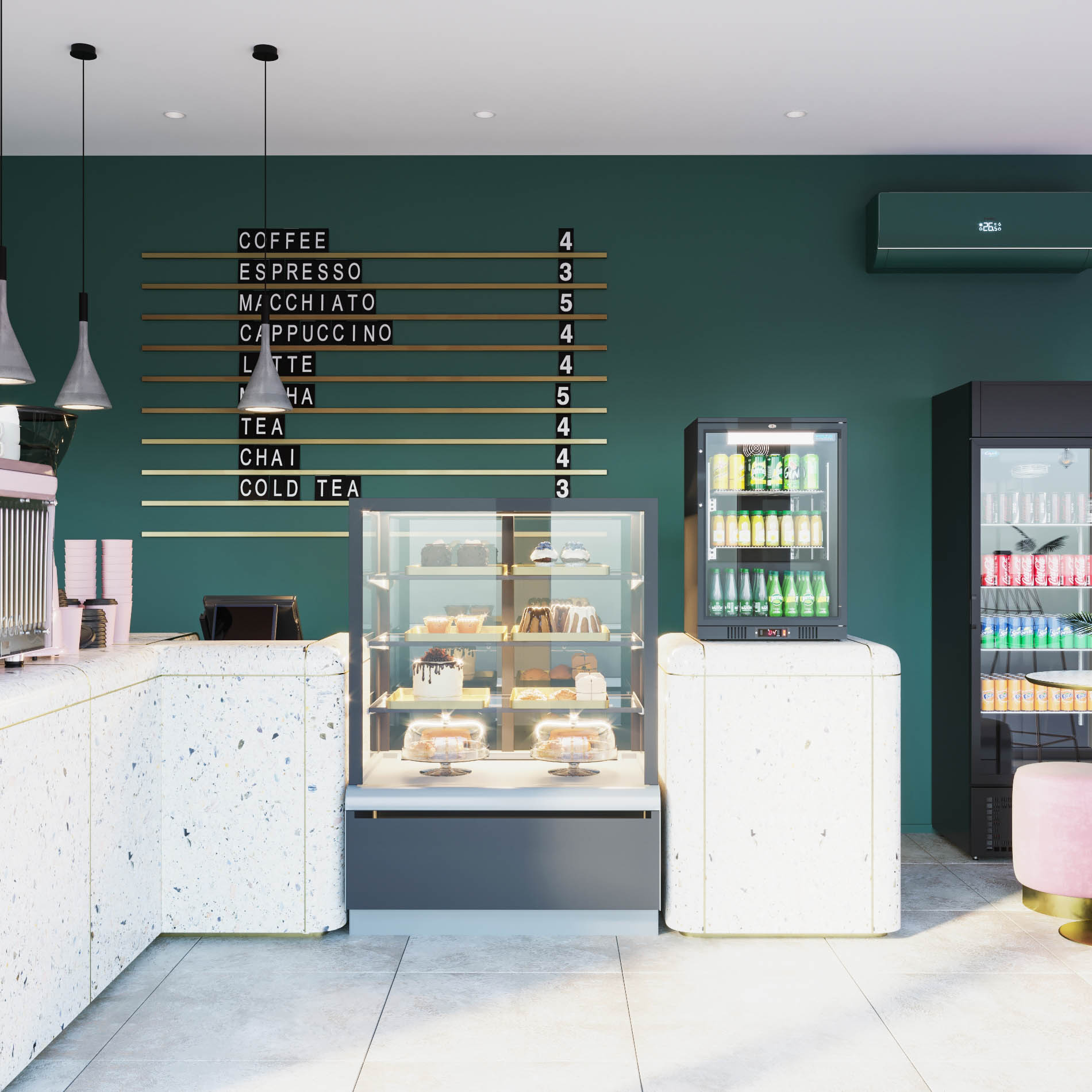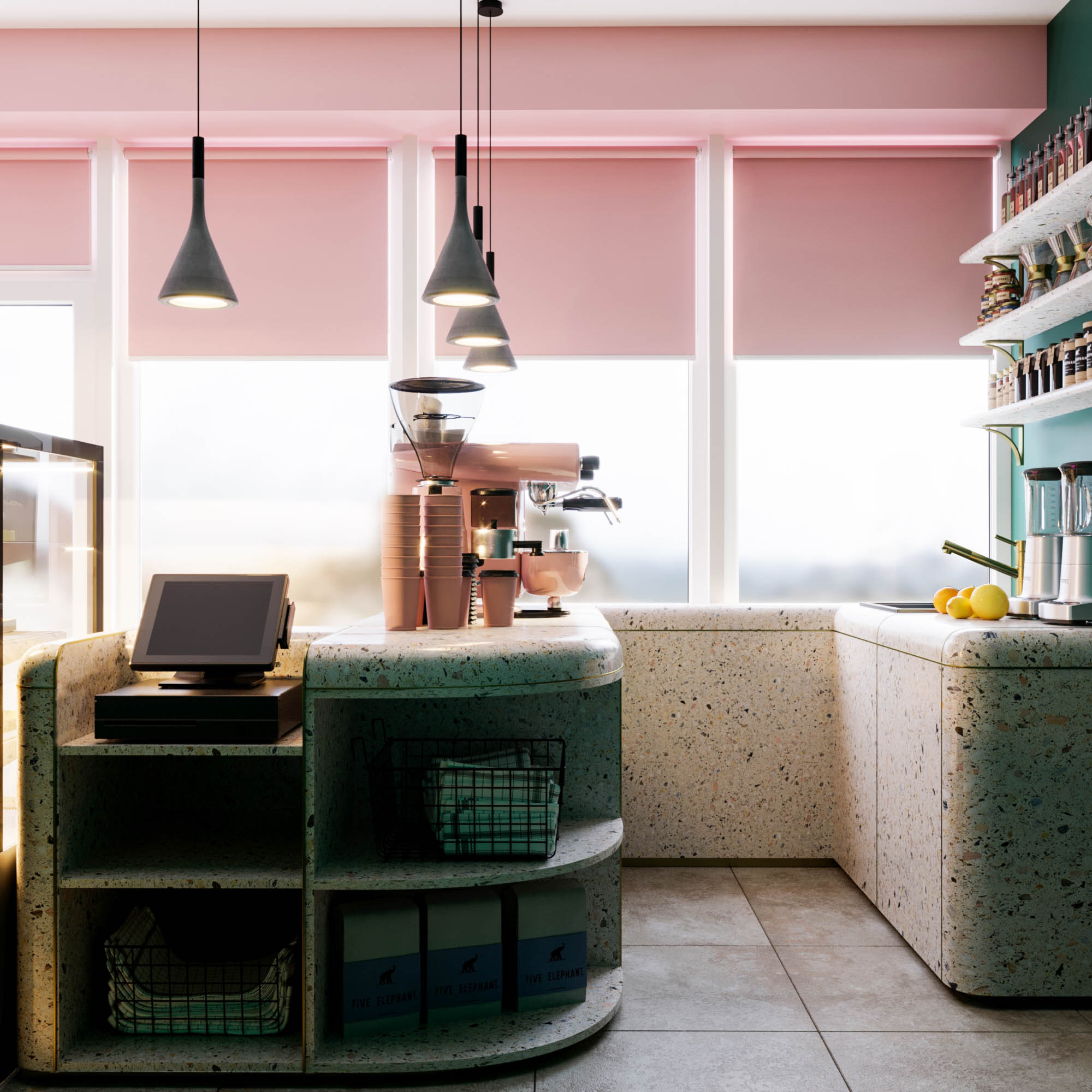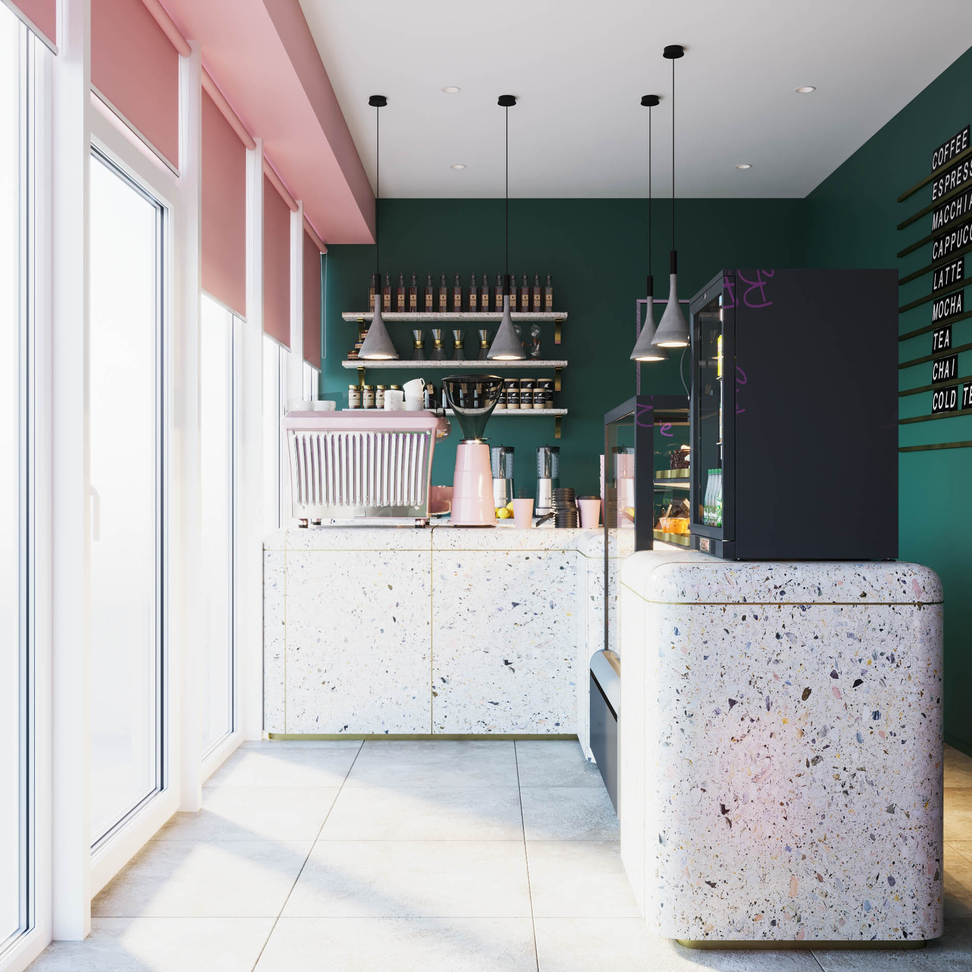 Основные цвета: зеленый и розовый, именно те оттенки, которые использовались в первой кофейне.