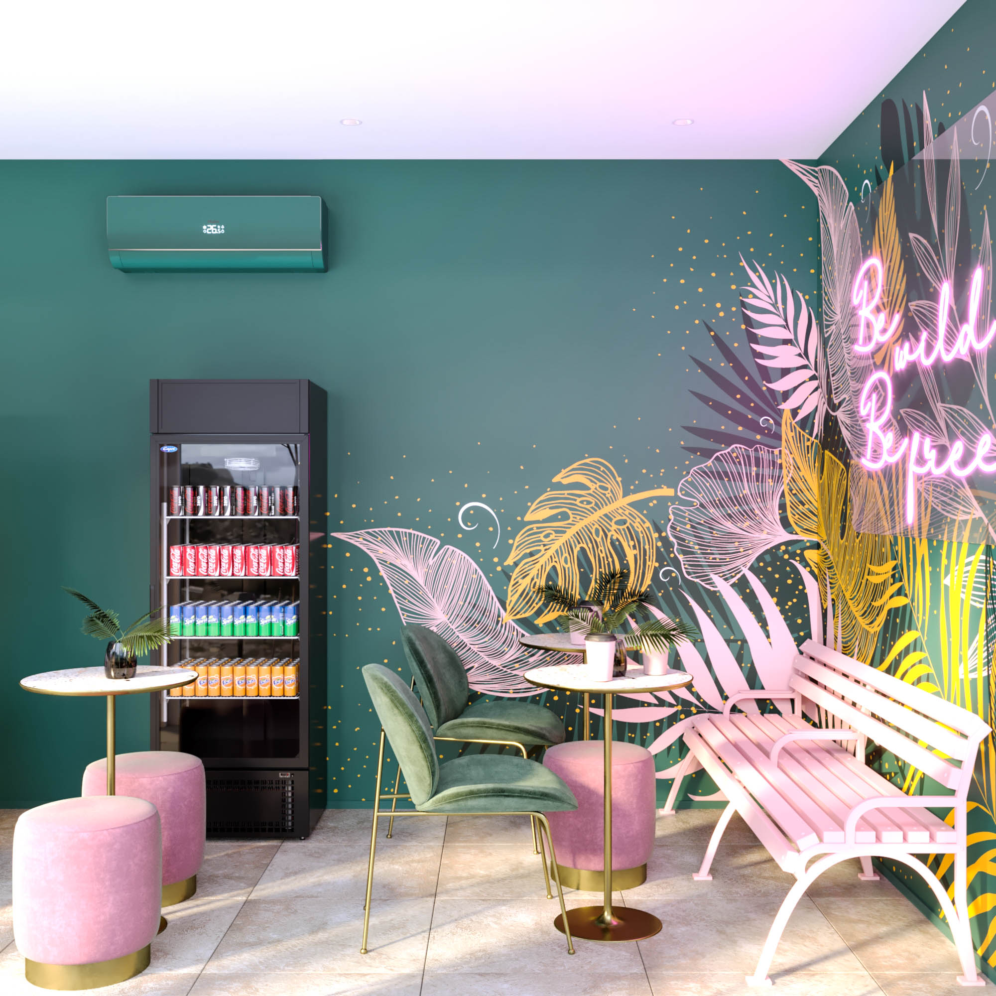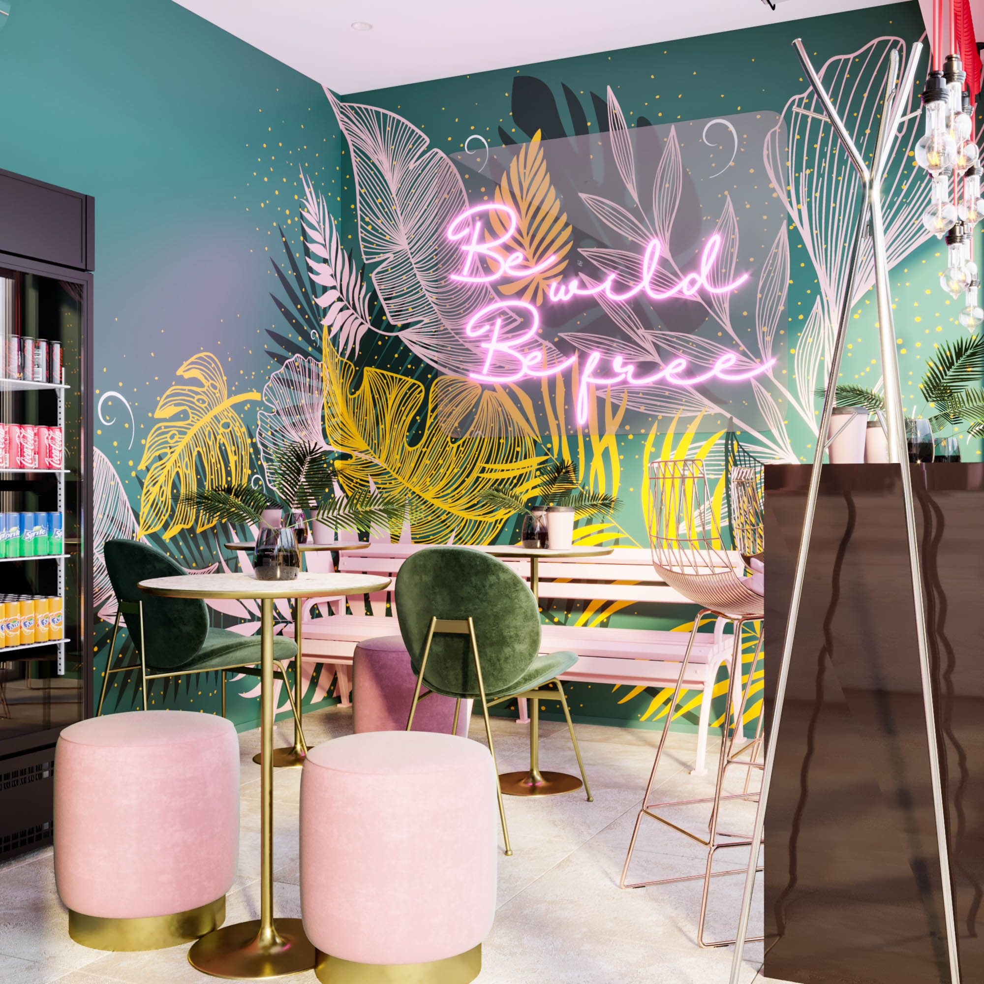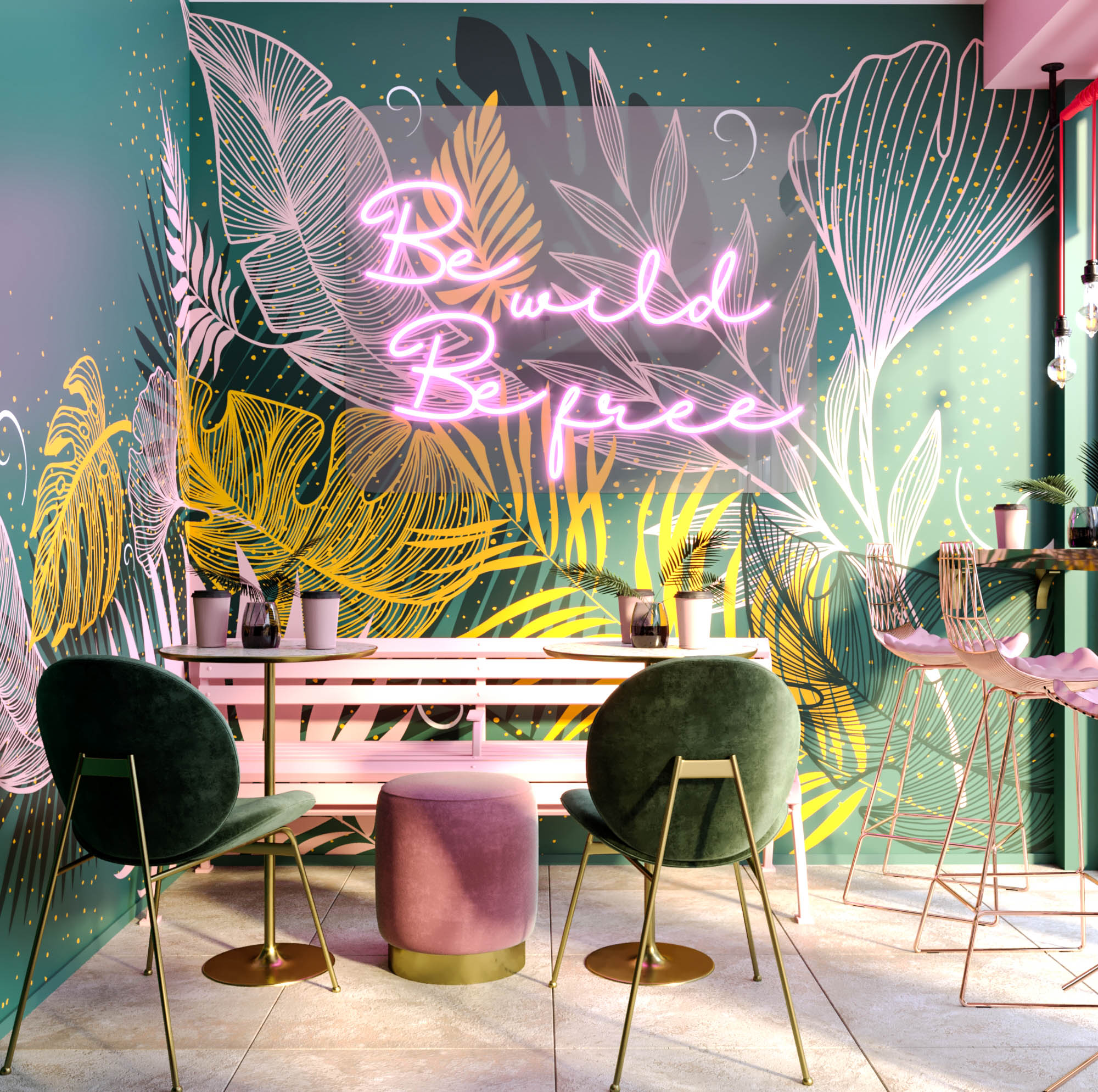 Рисунок выполнен в трафаретной технике. Сверху на пальмовые листья крепится неоновая вывеска со слоганом кофейни “Be wild be free”. А под надписью мы расположили розовую скамейку, своего рода арт-объект, которую делали на заказ. В итоге получилась стильная фотозона, где можно делать фото в стиле Pinterest с отметкой кафе.